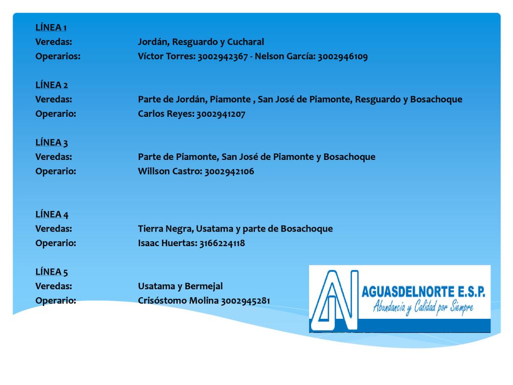 Con el fin de mejorar nuestra atención y Servicio al Cliente, presentamos el directorio de teléfonos de nuestros funcionarios del Área Operativa.